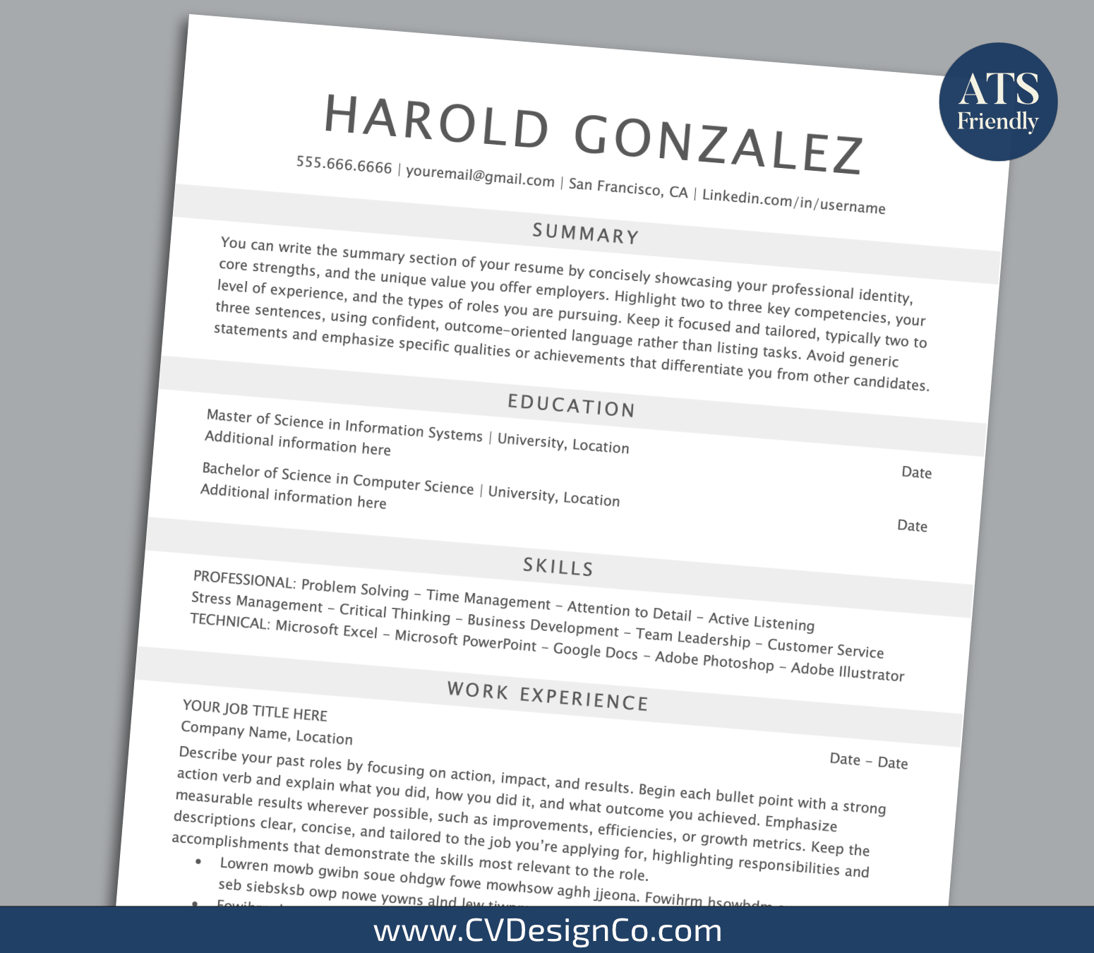 ATS Friendly Resume Template for MS Word, Professional and Simple CV Template Design, Clean Resume, 1-2 Page Resume Format, Instant Download: Harold Resume
