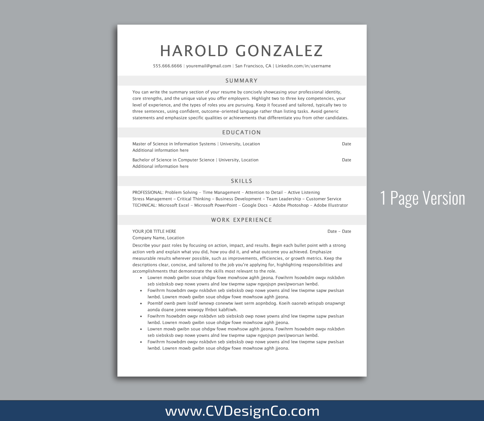 – 1 Page Resume/CV Template in MS Office .docx Format.