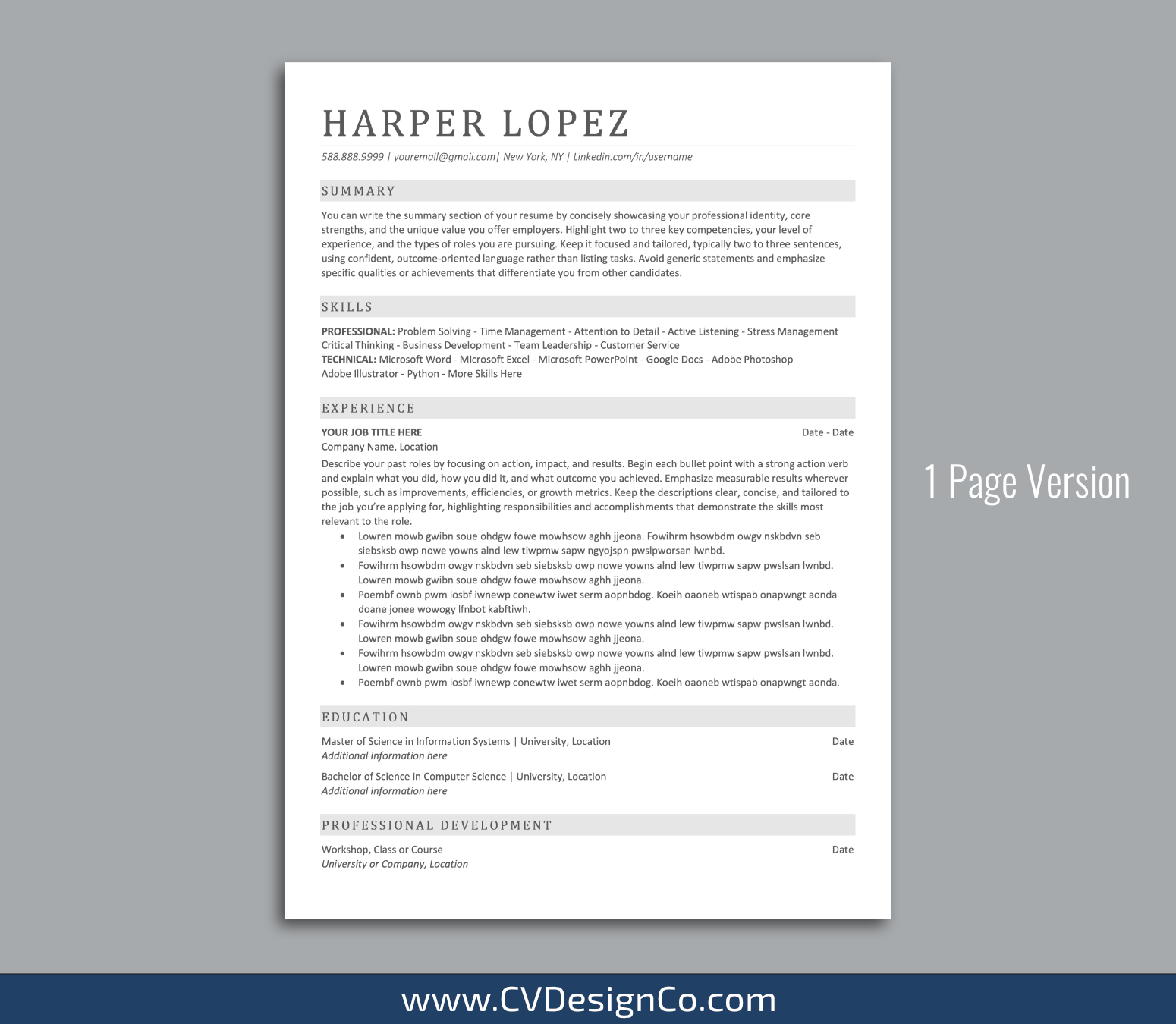 – 1 Page Resume/CV Template in MS Office .docx Format.