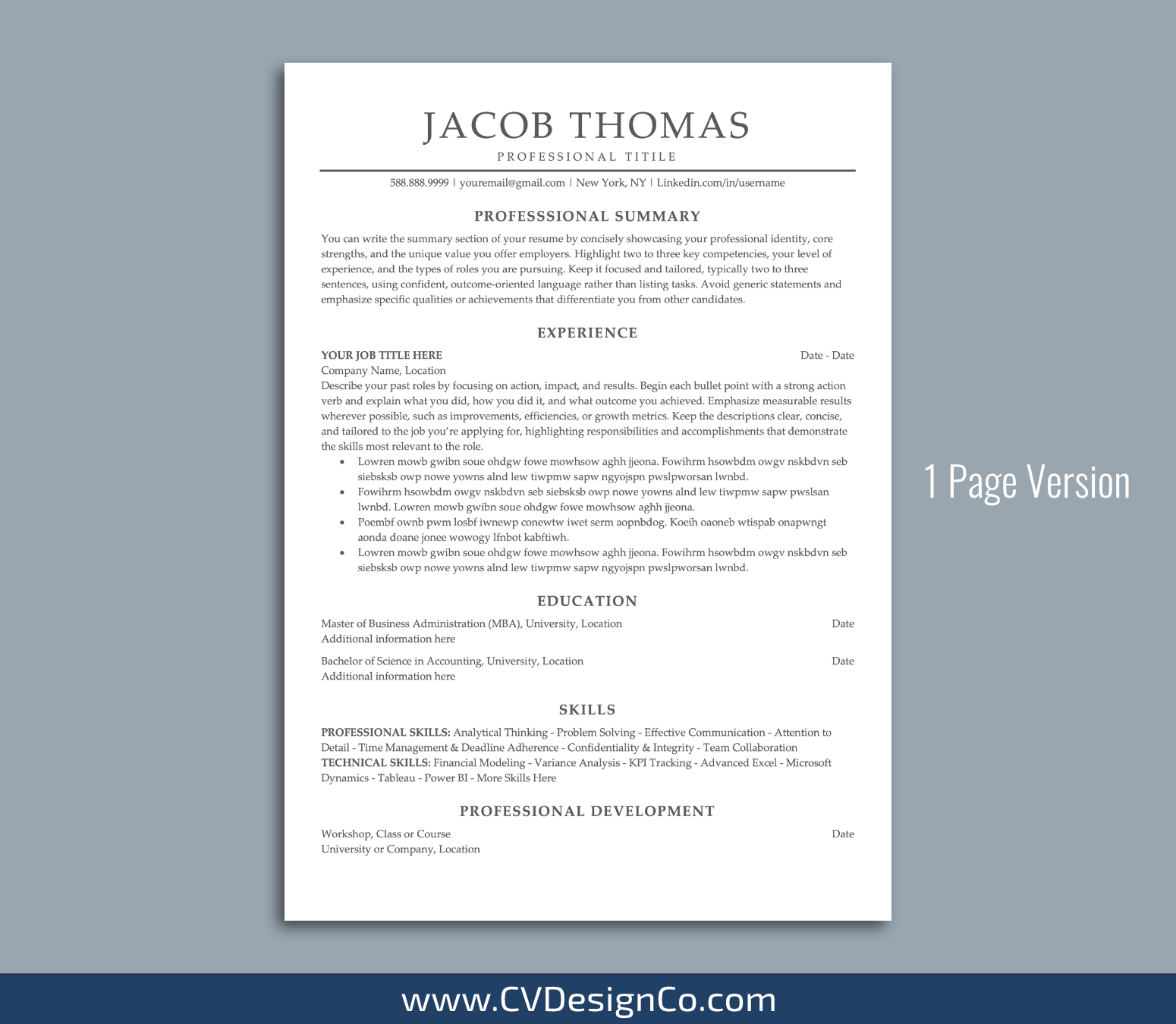 – 1 Page Resume/CV Template in MS Office .docx Format.