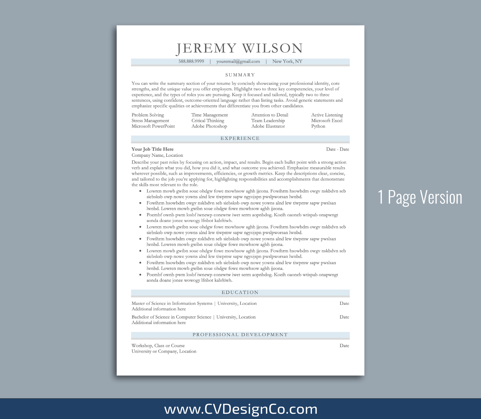 – 1 Page Resume/CV Template in MS Office .docx Format.