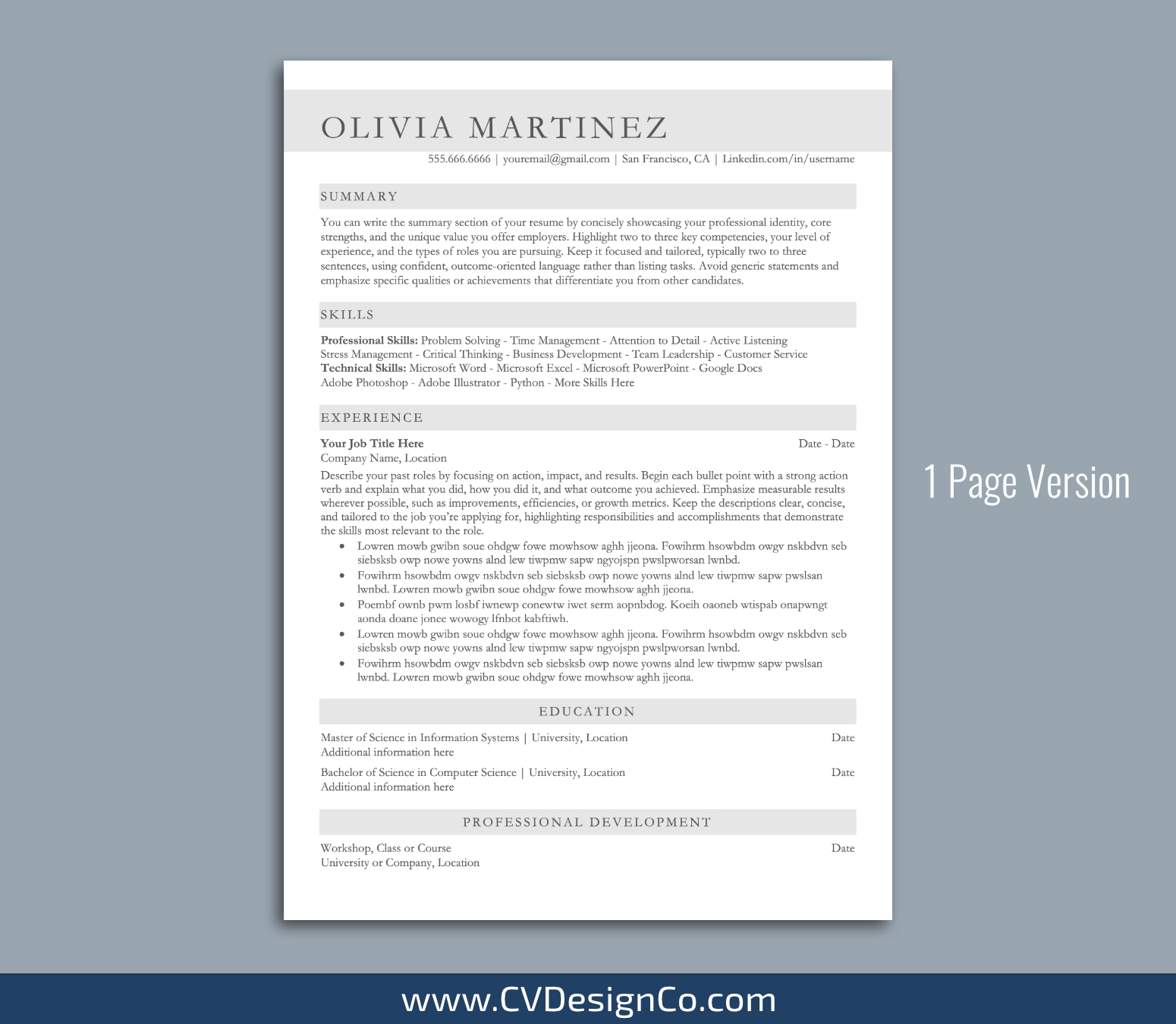 – 1 Page Resume/CV Template in MS Office .docx Format.