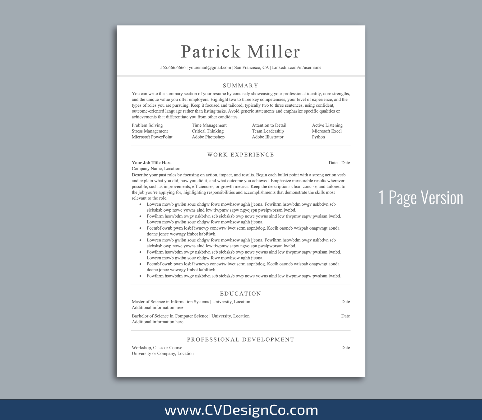 – 1 Page Resume/CV Template in MS Office .docx Format.